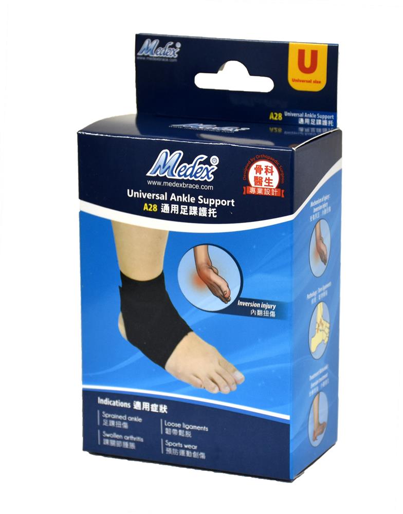 A28 通用足踝護托,以簡易8字型包紮作外翻復位治療,使外側韌帶撕裂靠攏癒合。產品具有以下特點: