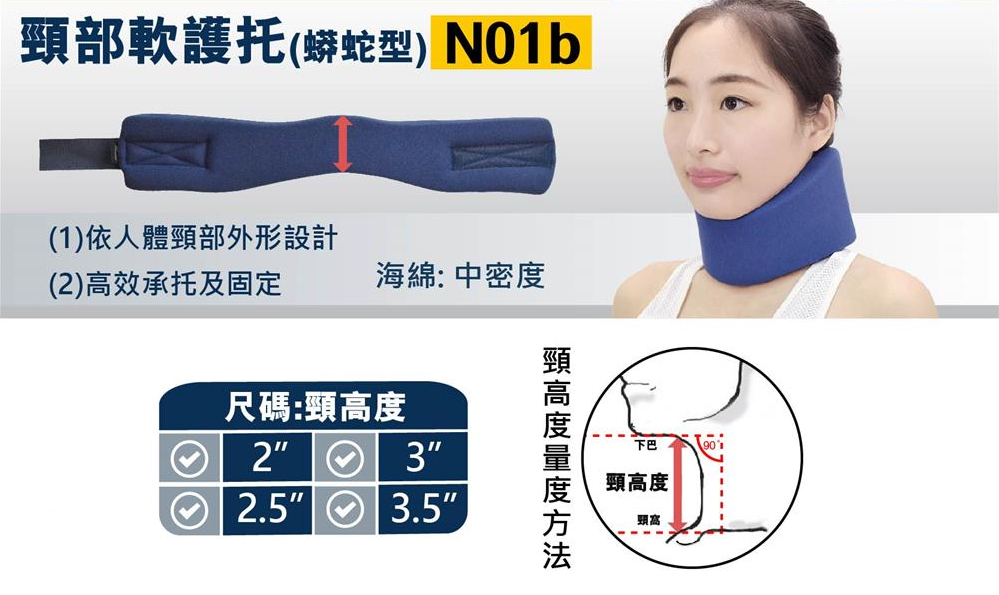 • 軟質頸護托採用中密度的海綿製成,常用於治療較輕的頸部損傷(落枕)或在拆除硬質頸護託後的過渡期使用